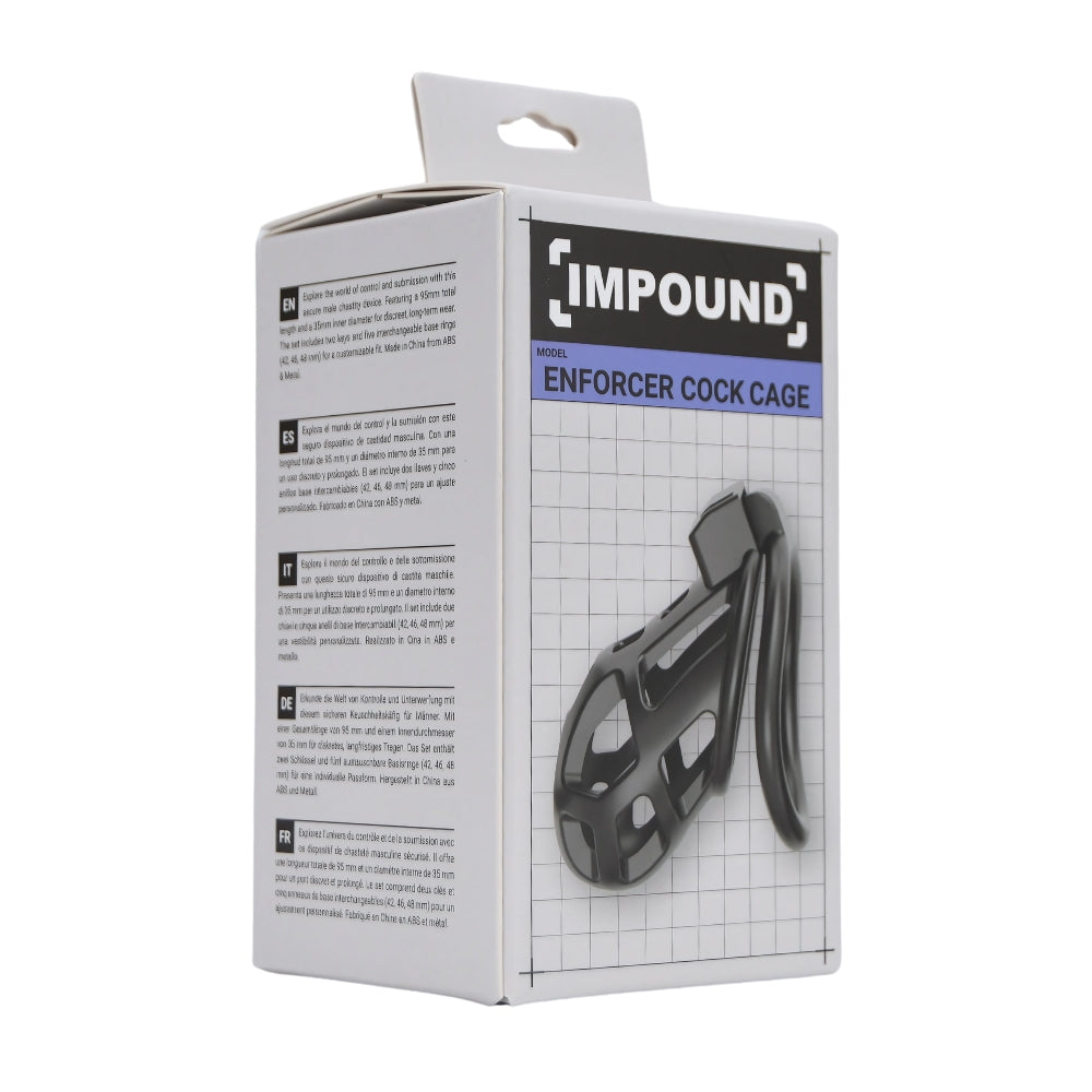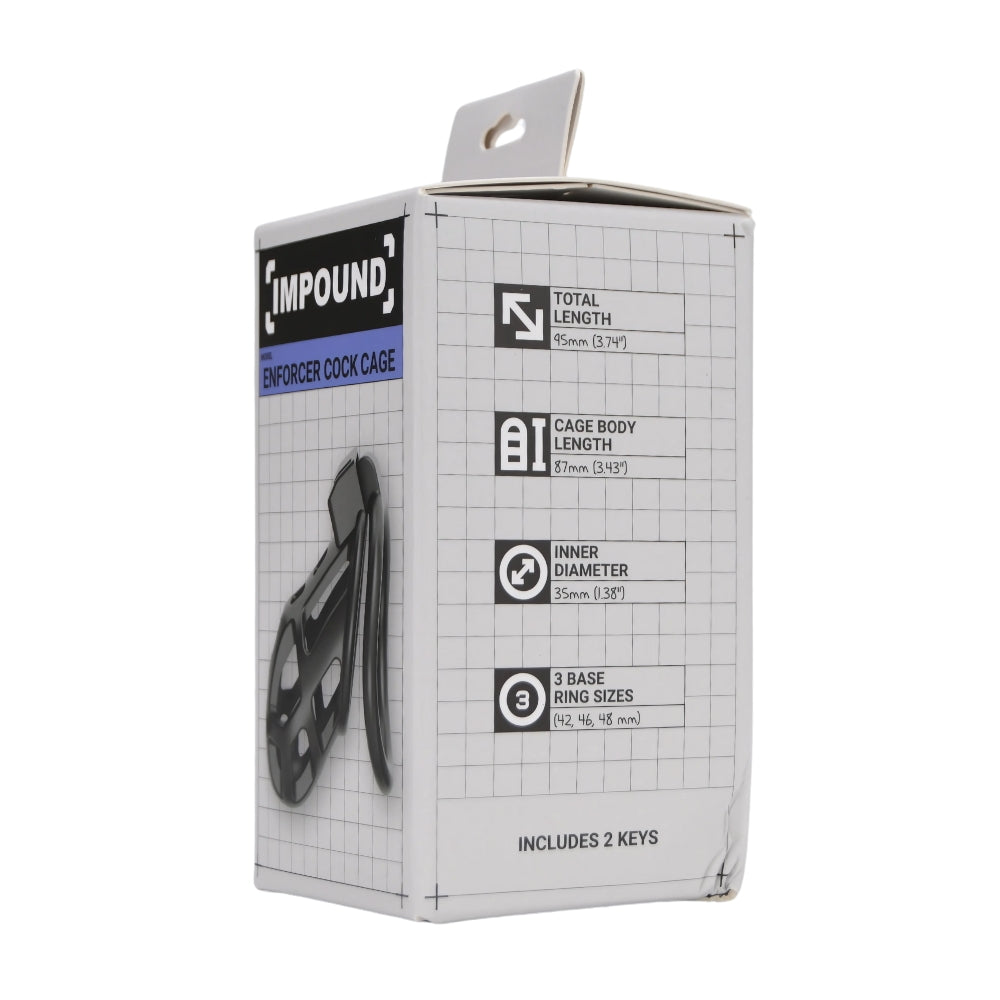Experience next-level control with the Impound Enforcer Cock Cage - a discreet, ultra-secure chastity device designed for both beginners and experienced wearers. With a more compact profile and breathable, open-frame design, the Enforcer offers comfort and hygiene for longer wear while still keeping you locked firmly in place. Featuring three base ring sizes and a snug 35mm inner diameter, it provides a customizable fit. Crafted from durable ABS with a touch of metal, this lightweight 34.5g cage is built for restraint that doesn't compromise on comfort.